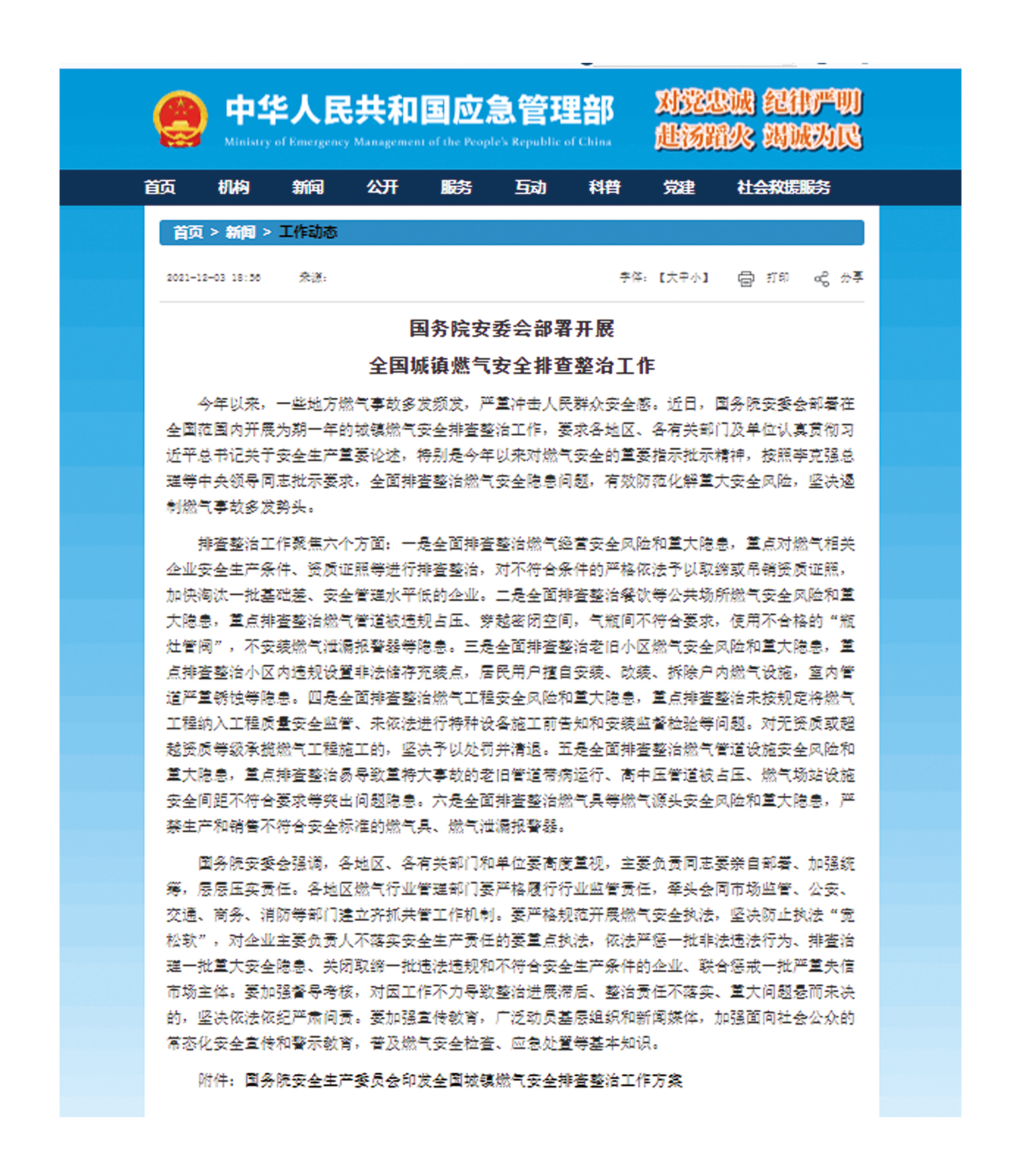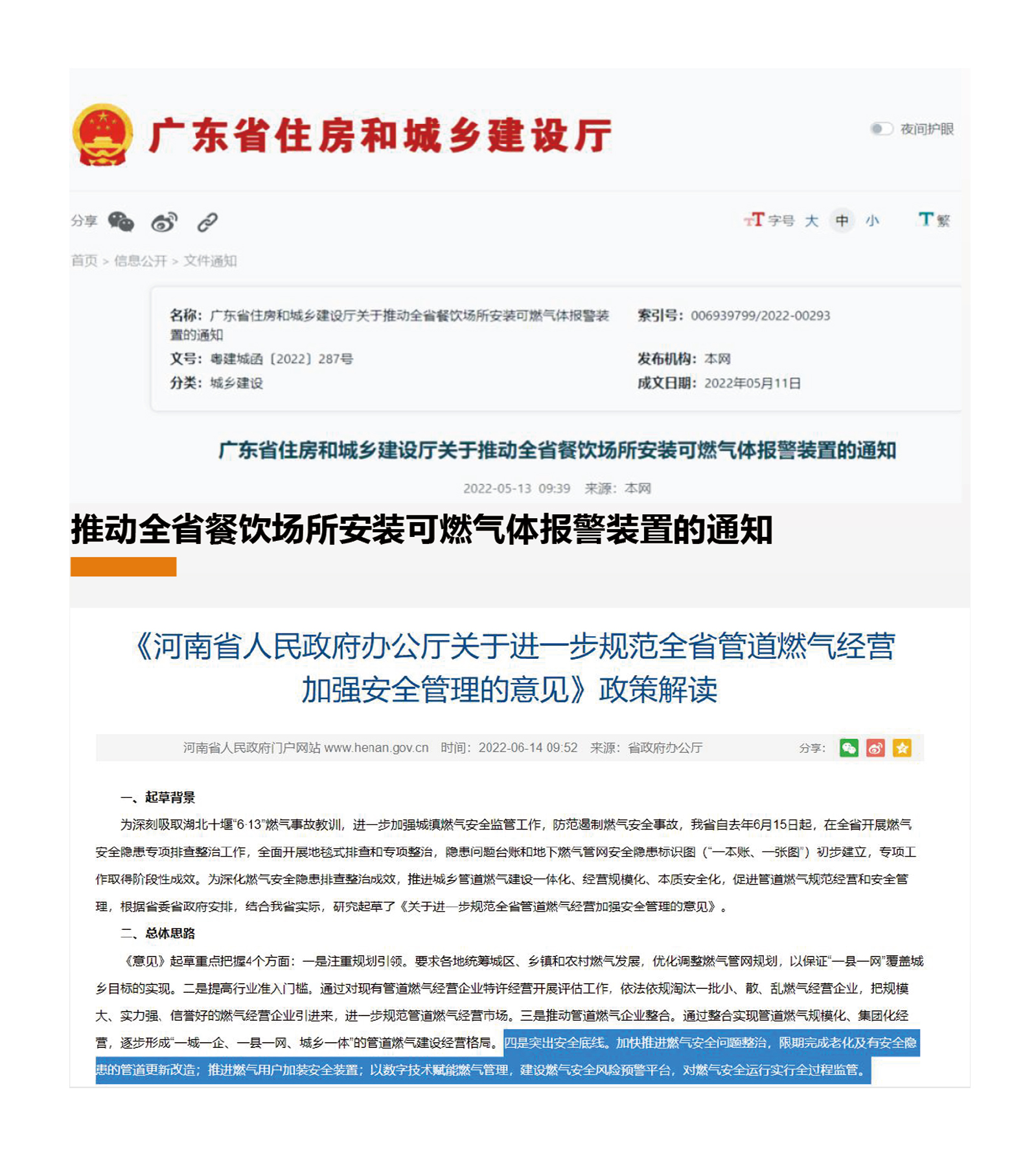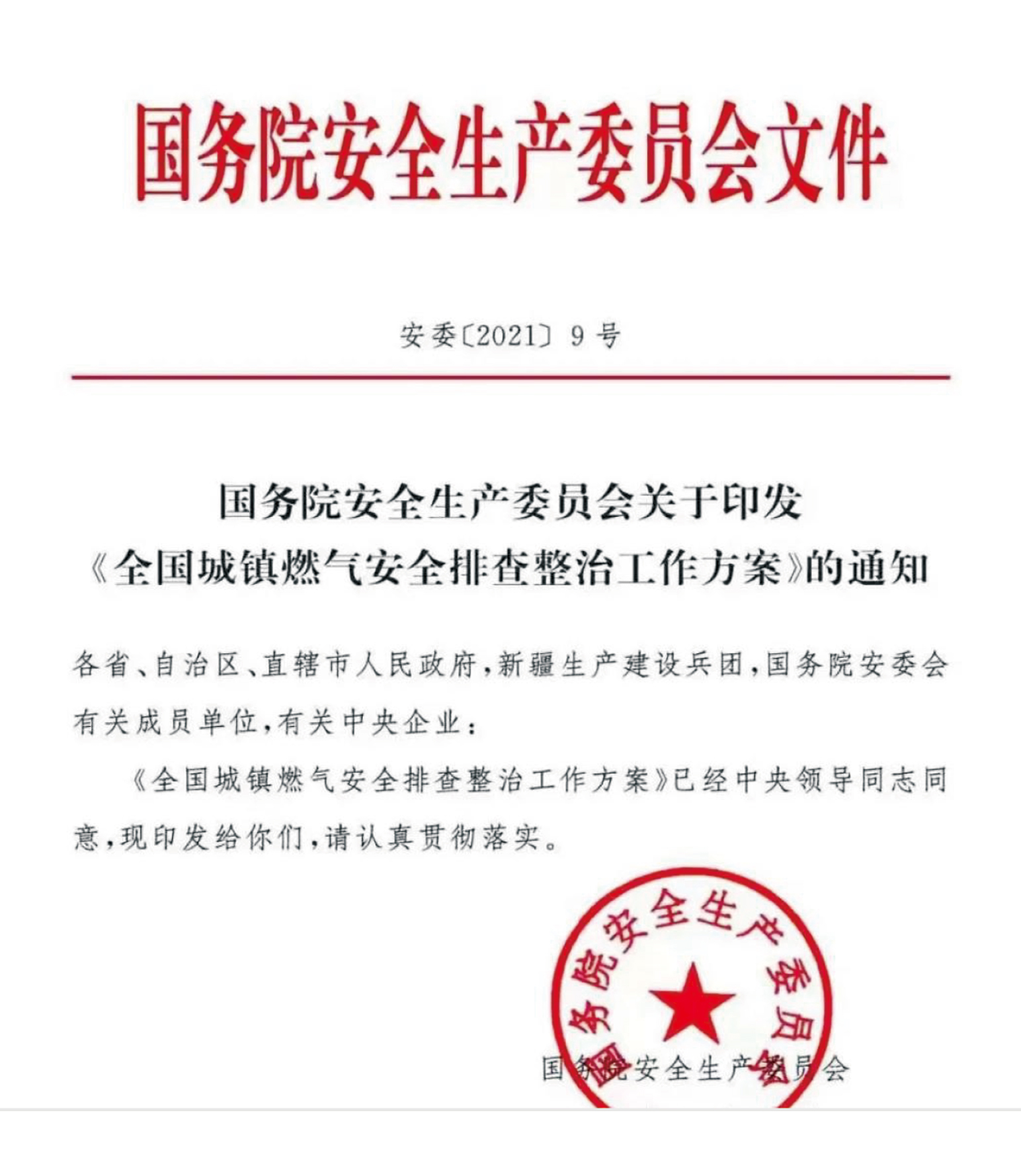 国家及各省市推出《全国城镇燃气安全排查整治工作方案》、《进一步规范全省管道燃气经营加强安全管理的意见》等政策,开展燃气安全“百日行动”,大力推动燃气行业安全建设,并鼓励以数字化技术赋能燃气行业,建设燃气安全风险预警平台等,对燃气安全运行实施全过程监管。